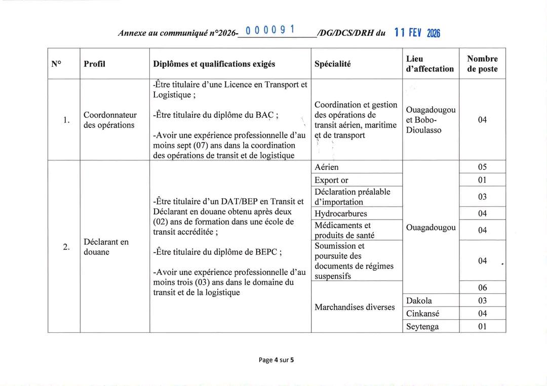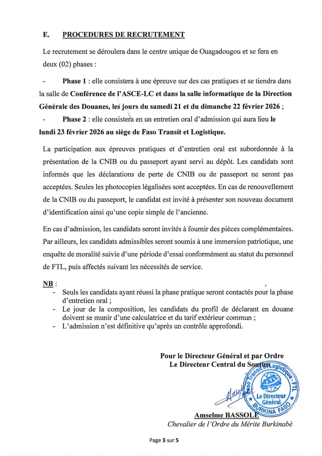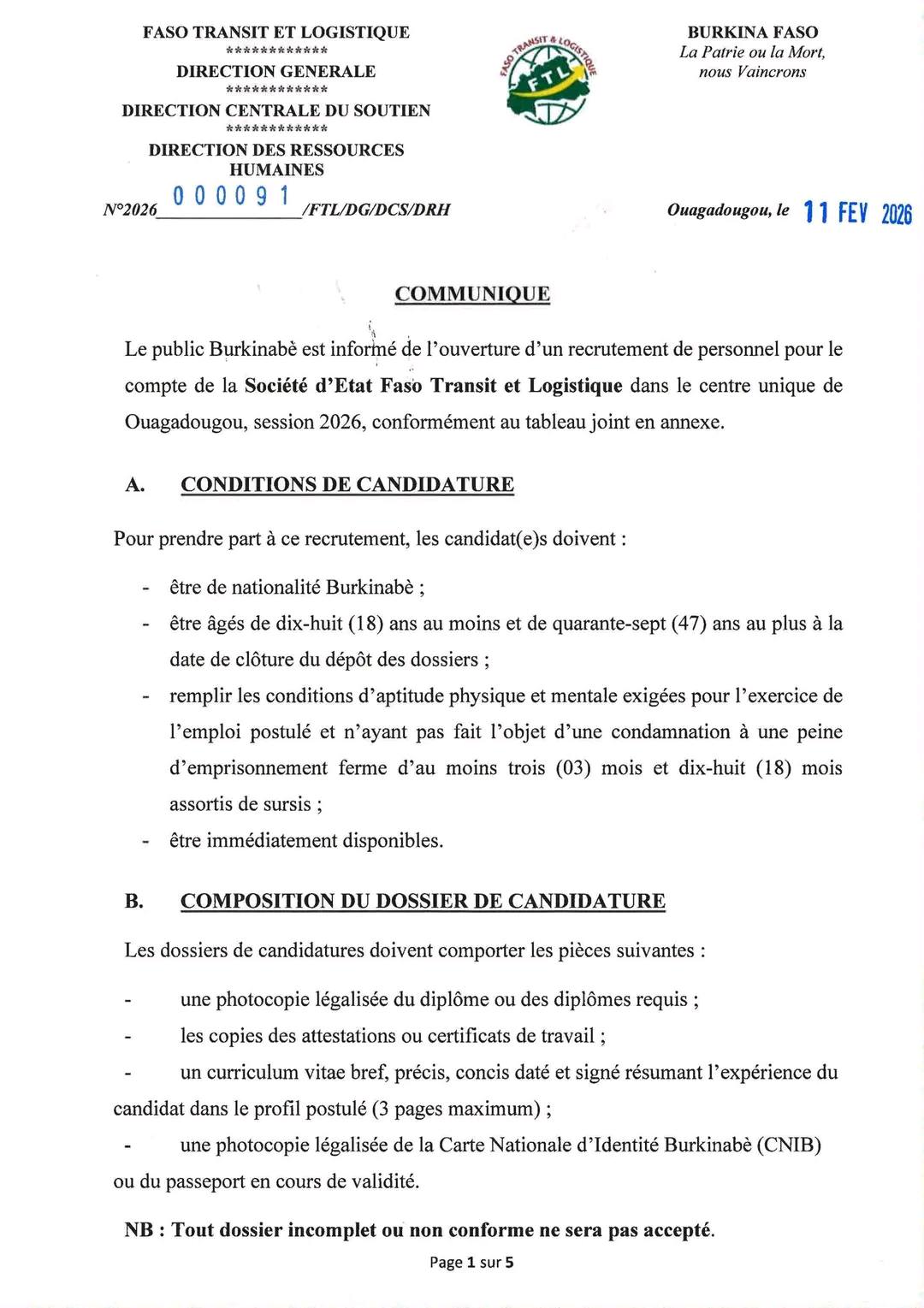 Le public Burkinabè est informé de l’ouverture d’un recrutement de personnel pour le compte de la Société d’Etat Faso Transit et Logistique dans le centre unique de Ouagadougou, session 2026, conformément au tableau joint en annexe.