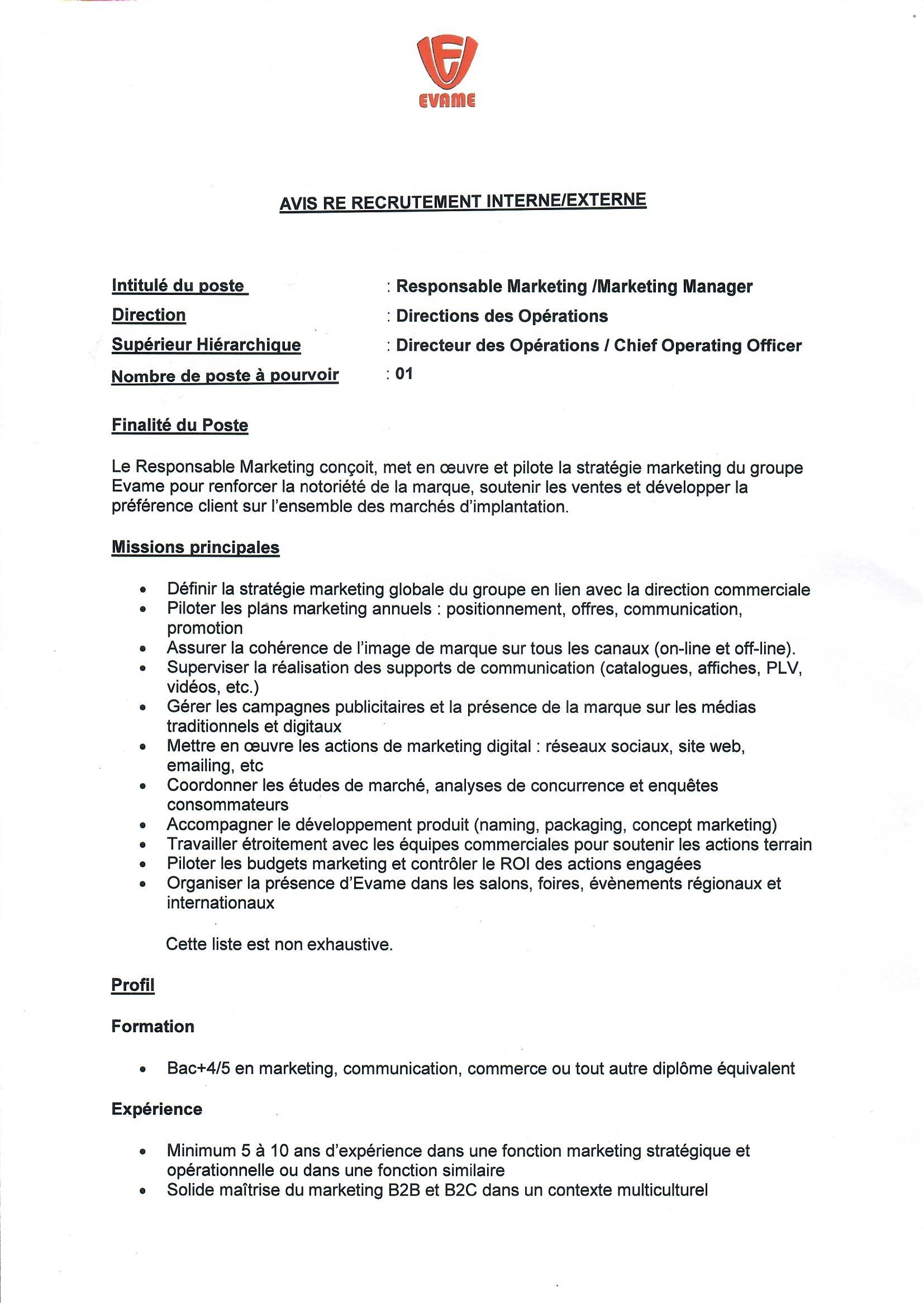 TOUS LES DÉTAILS DE L’OFFRE D’EMPLOI POUR LE POSTE DE Responsable Marketing au GROUPE EVAME SA