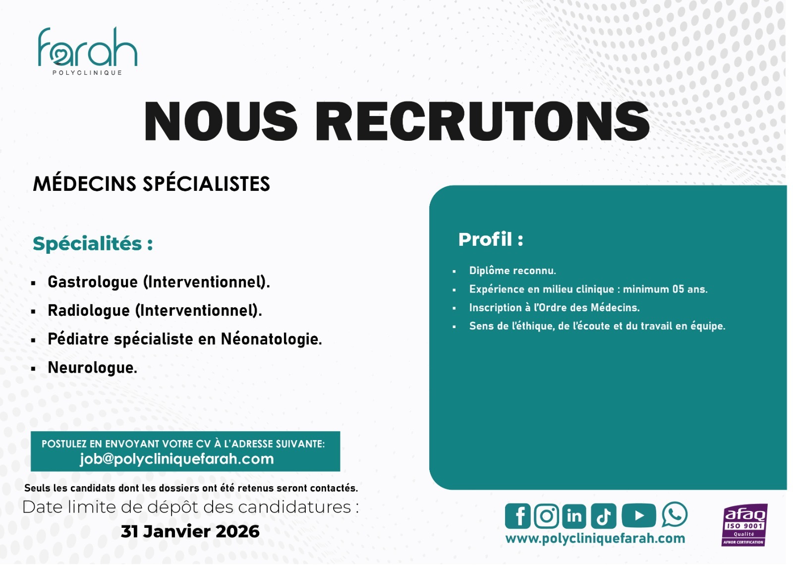 La polyclinique Farah recrute. Rejoignez une équipe d’excellence où chaque talent contribue à offrir des soins de qualité et un accompagnement humain à nos patients.