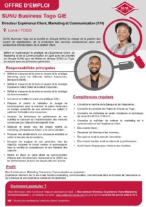 SUNU Business Togo GIE recrute un(e) Directeur(trice) Expérience Client, Marketing et Communication (F/H) basé(e) à Lomé.