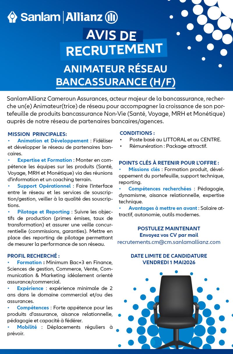 SanlamAllianz Cameroun Assurances, acteur majeur de la bancassurance, recherche un(e) Animateur(trice) de réseau pour accompagner la croissance de son portefeuille de produits bancassurance Non-Vie (Santé, Voyage, MRH et Monétique) auprès de notre réseau de partenaires bancaires/agences.