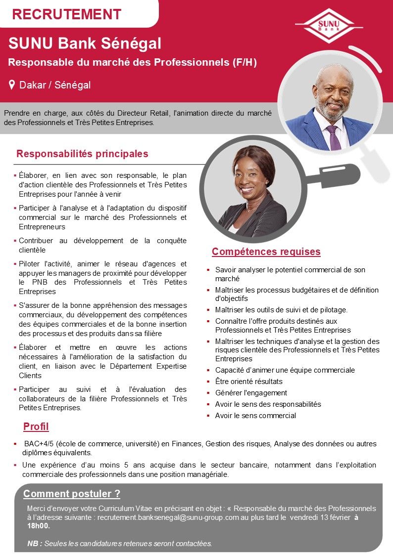 Poste : Responsable du marché des Professionnels (F/H) Lieu : Dakar, Sénégal