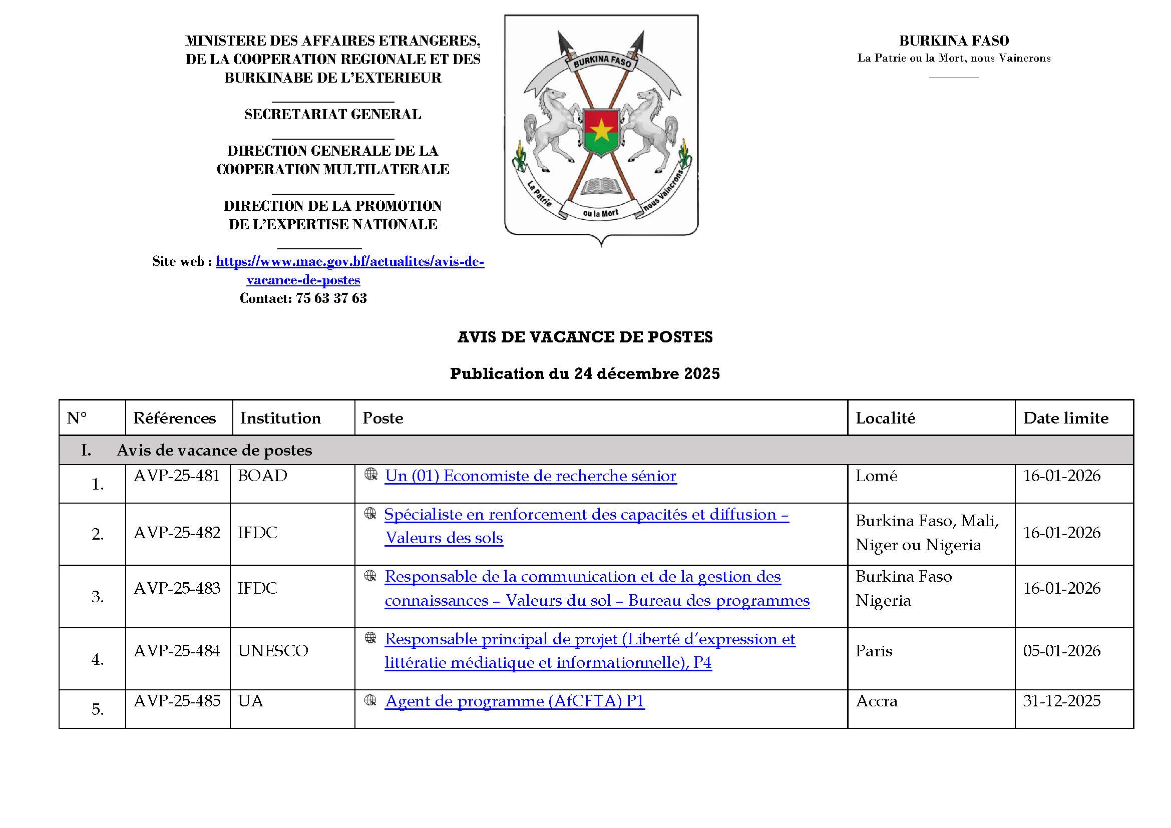 | 1. | AVP-25-481 | BOAD | Un (01) Economiste de recherche sénior | Lomé | 16-01-2026 |