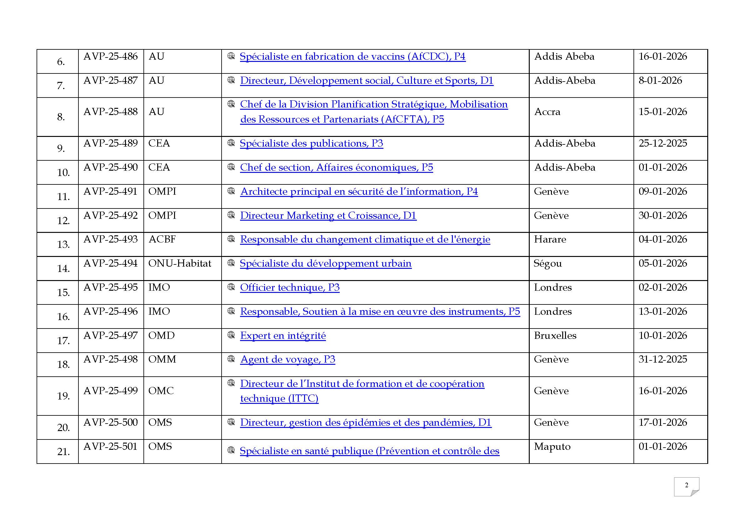 | 5. | AVP-25-485 | UA | Agent de programme (AfCFTA) P1 | Accra | 31-12-2025 |