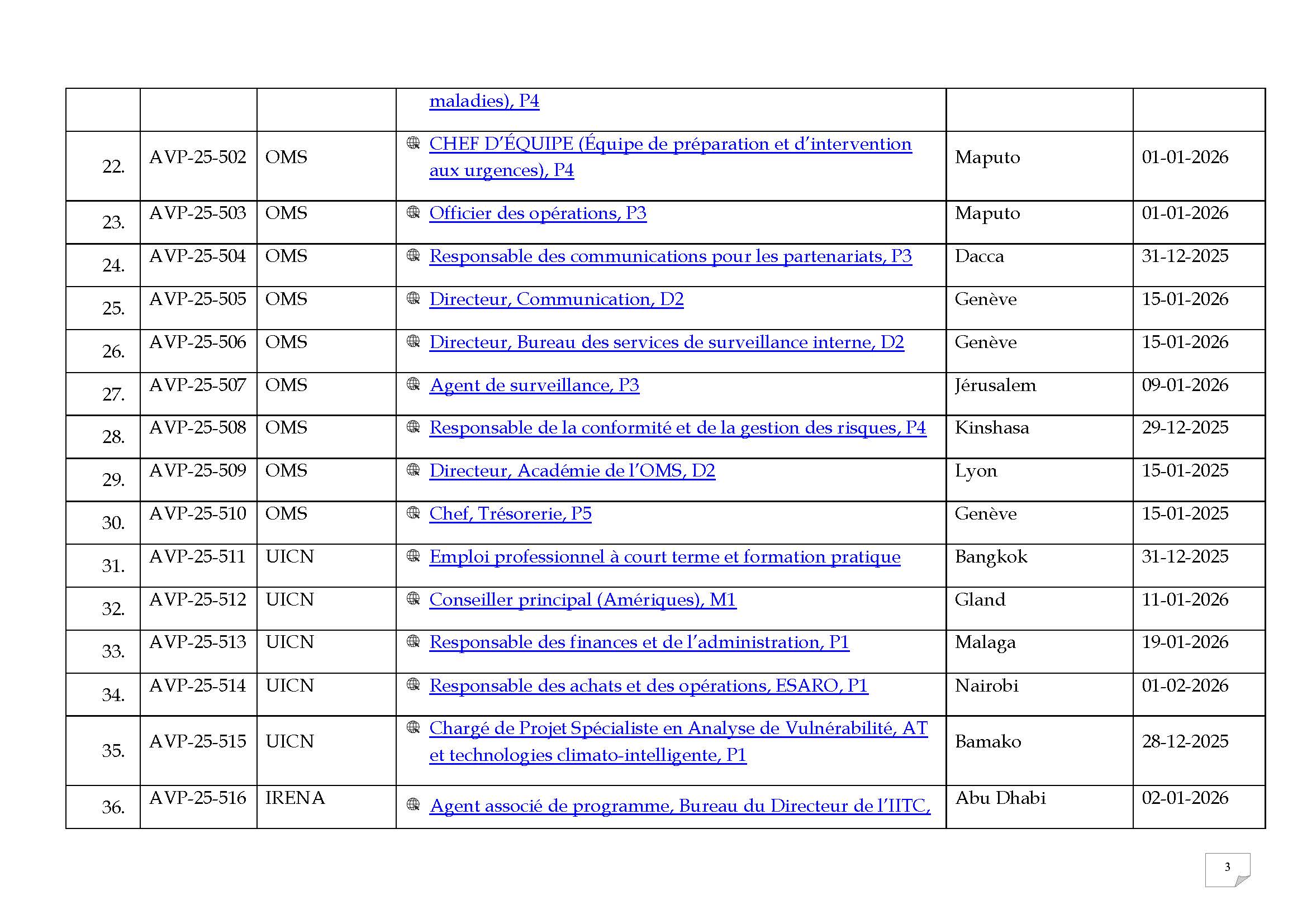 | 2 | OC-25-07 | OMS | Consultant – Engagement et Coordination des Partenariats | Genève | 31-12-2025 |