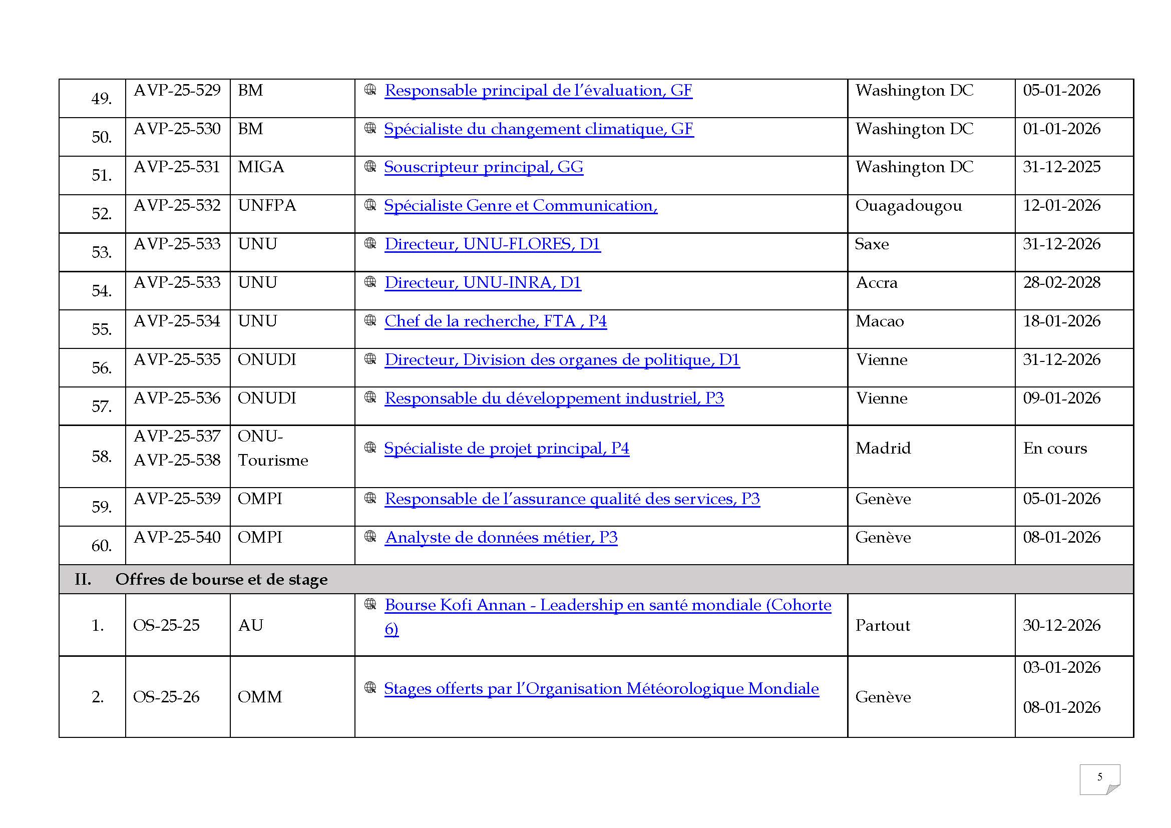| 57. | AVP-25-536 | ONUDI | Responsable du développement industriel, P3 | Vienne | 09-01-2026 |