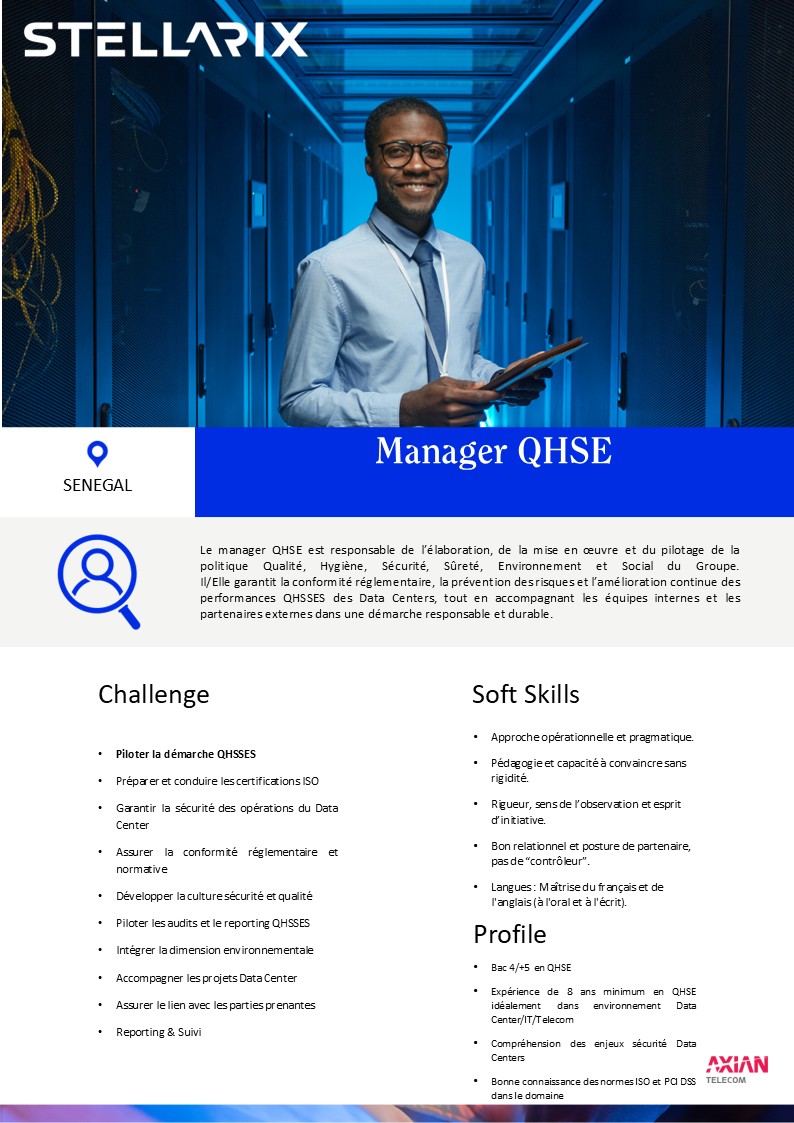 Expérience : Minimum de 5 ans d’expérience dans les services financiers, idéalement dans le secteur du mobile money ou de la Fintech.