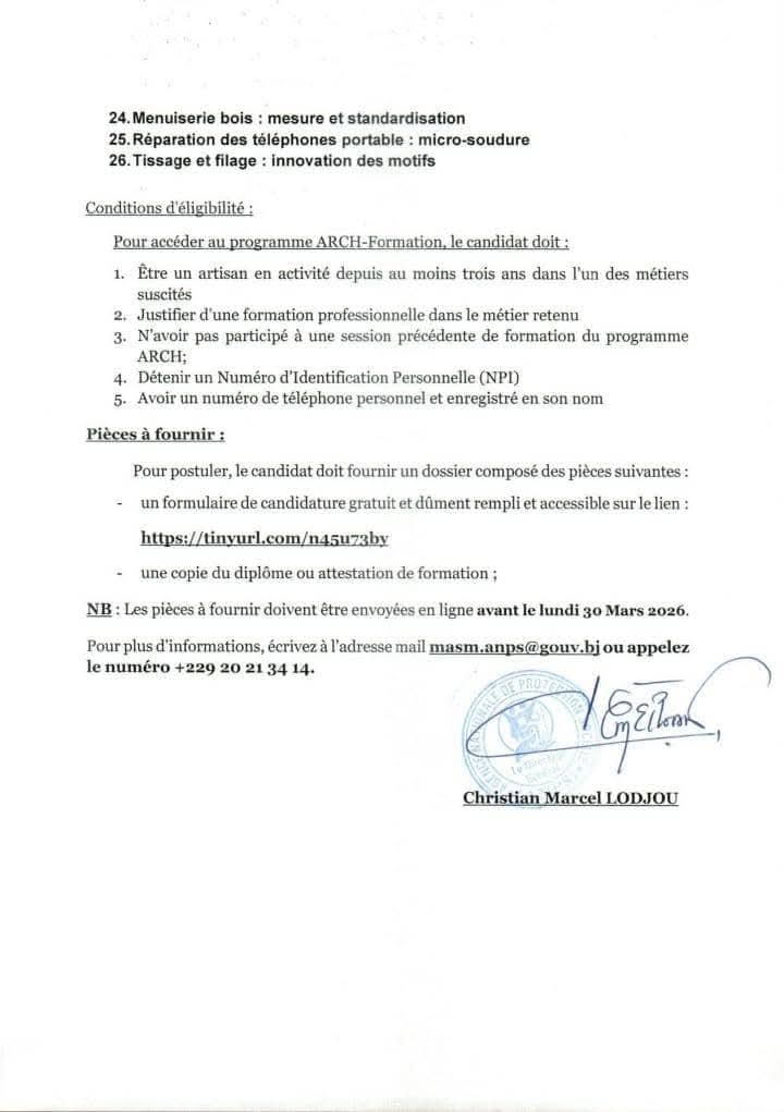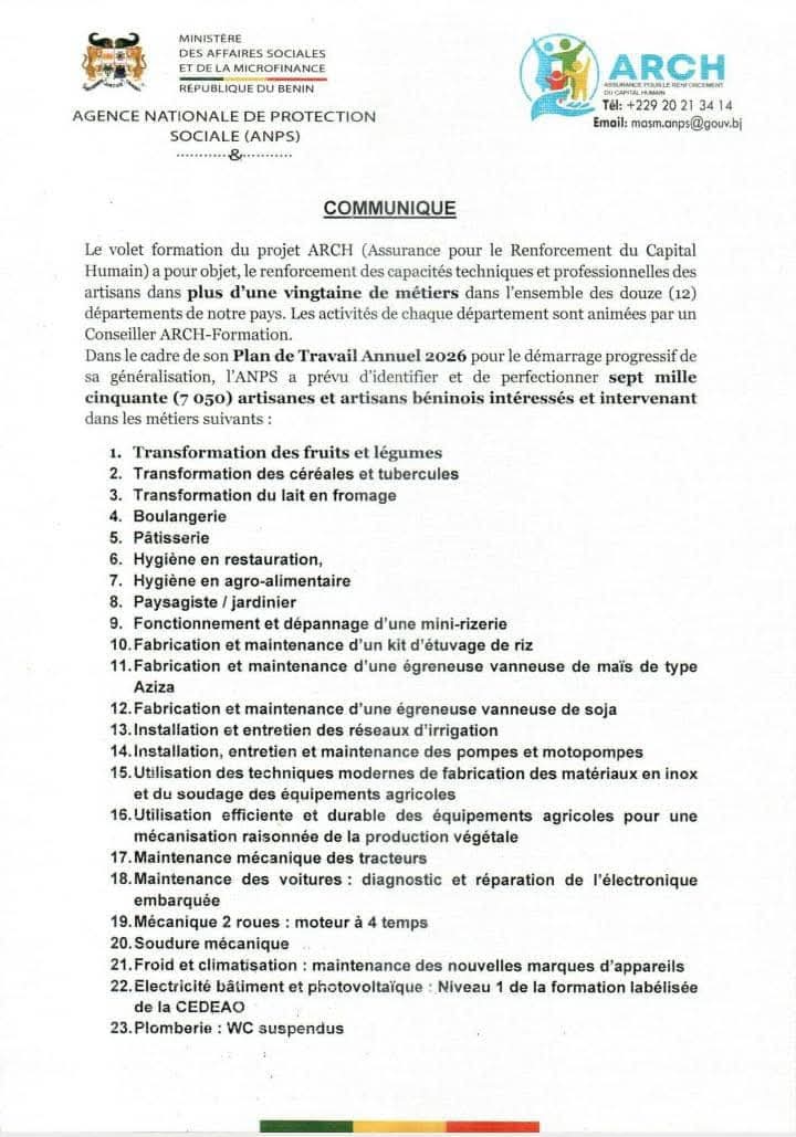 Dans le cadre de son Plan de Travail Annuel 2026, l’Agence Nationale de Protection Sociale (ANPS), en partenariat avec le projet ARCH, lance une grande campagne de formation professionnelle au profit de 7 050 artisans Béninois dans les 12 départements du Bénin.