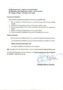 Objectif : renforcer les compétences techniques et professionnelles dans 26 métiers porteurs (agroalimentaire, mécanique, électricité, plomberie, menuiserie, froid & climatisation, réparation de téléphones, tissage, etc.).