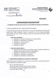 La Direction Générale des Eaux, Forêts et Chasse lance une nouvelle phase de recrutement pour plusieurs postes restés vacants à l’issue des épreuves écrites et d’entretien.