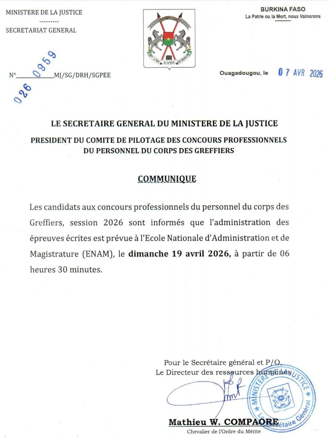 Les candidats aux concours professionnels du personnel du corps des Greffiers, session 2026 sont informés que l’administration des épreuves écrites est prévue à l’Ecole Nationale d’Administration et de Magistrature (ENAM), le dimanche 19 avril 2026, à partir de 06 heures 30 minutes.