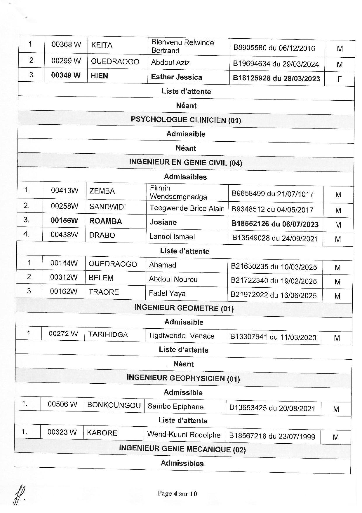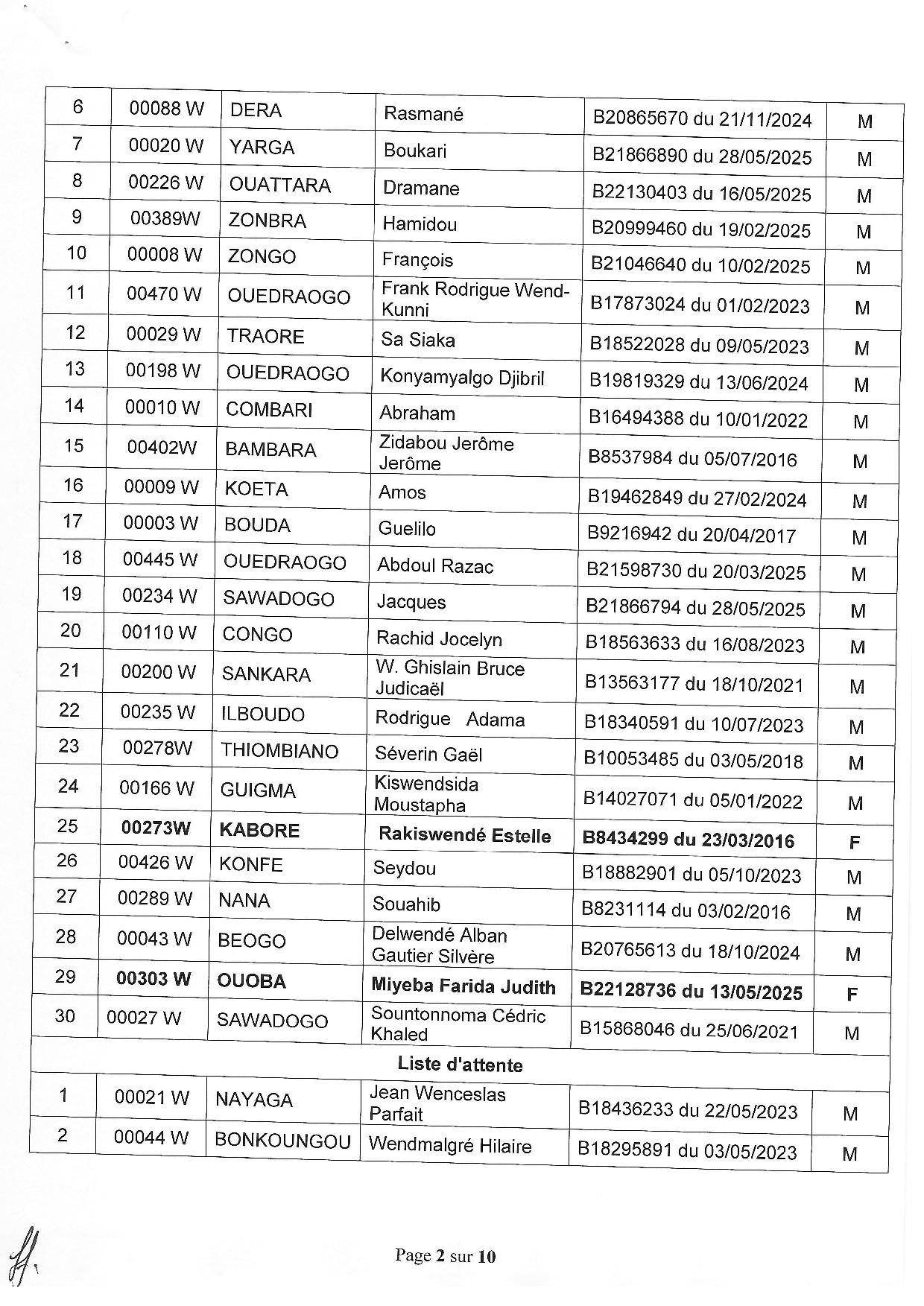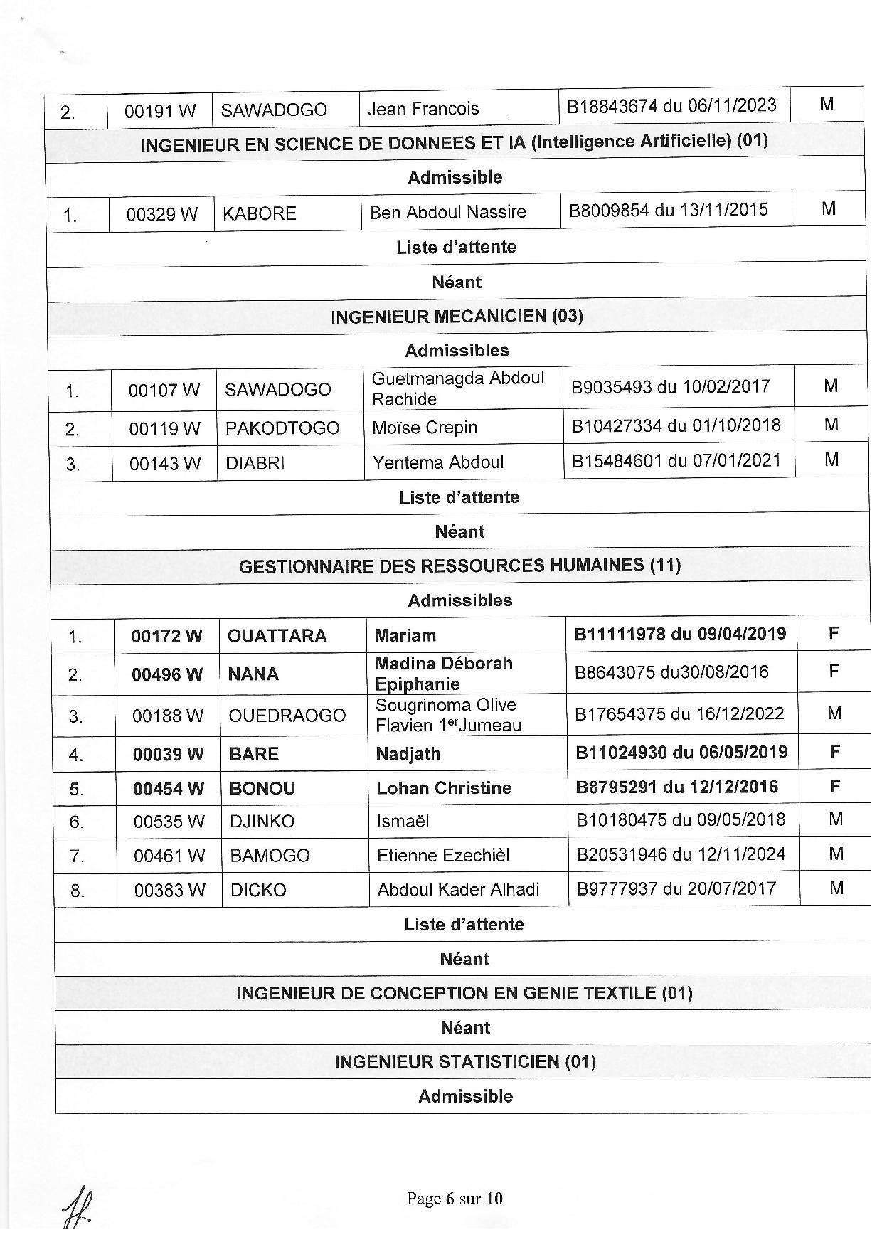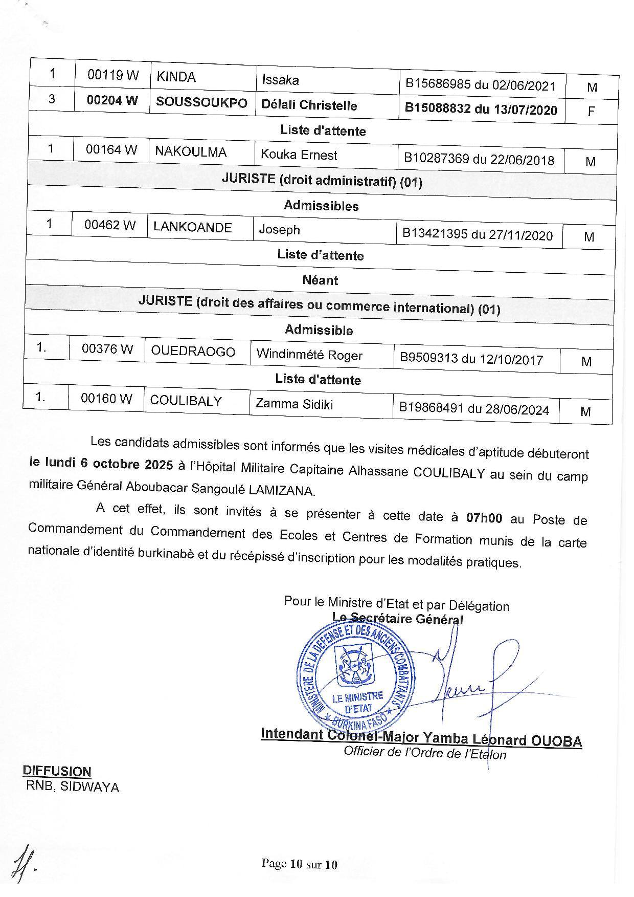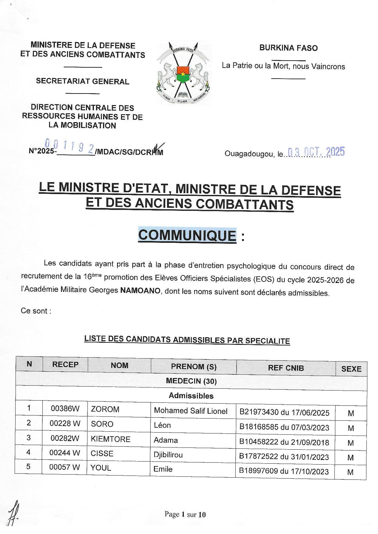 Les candidats ayant pris part à la phase d’entretien psychologique du concours direct de recrutement de la 16ème promotion des Elèves Officiers Spécialistes (EOS) du cycle 2025-2026 de l’Académie Militaire Georges NAMOANO, dont les noms suivent sont déclarés admissibles.