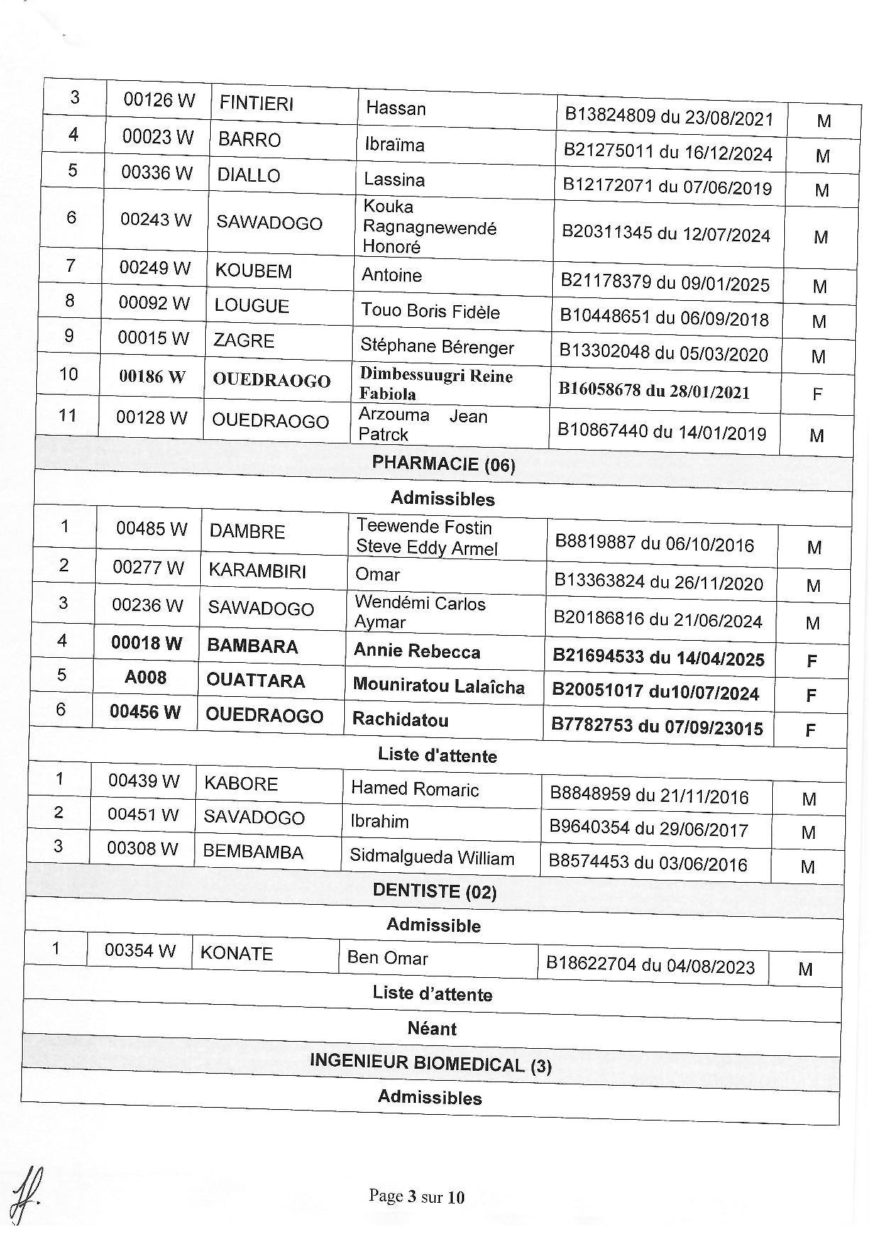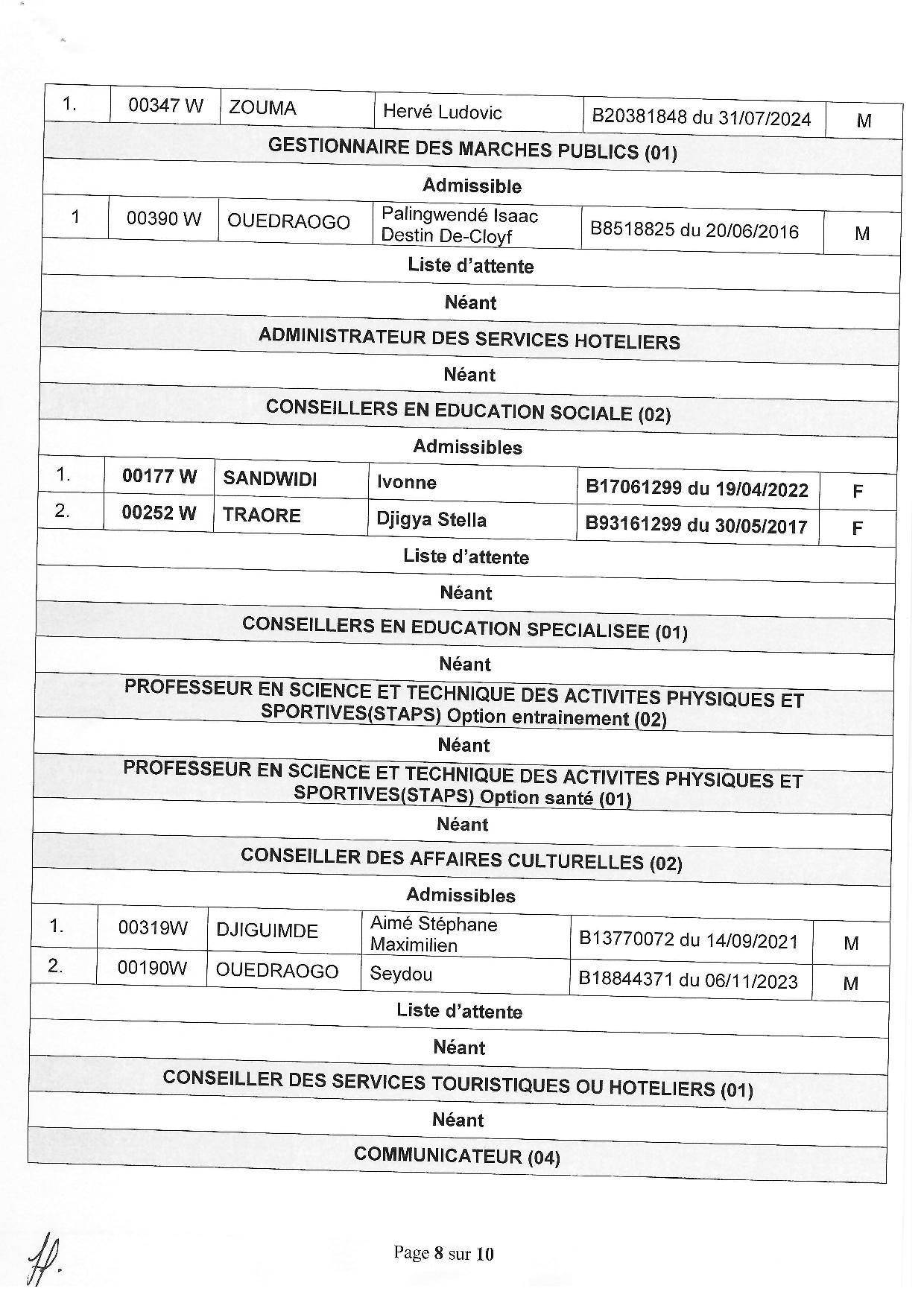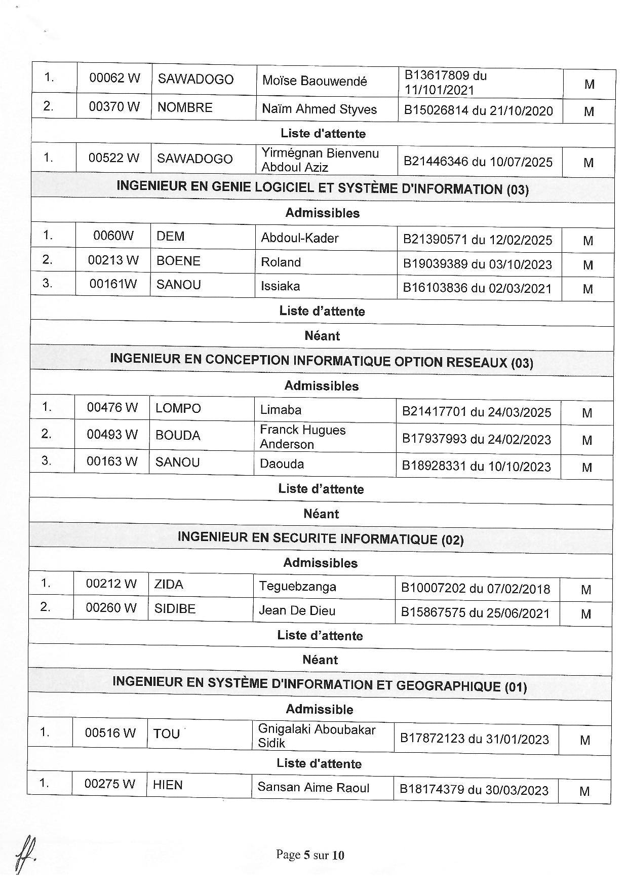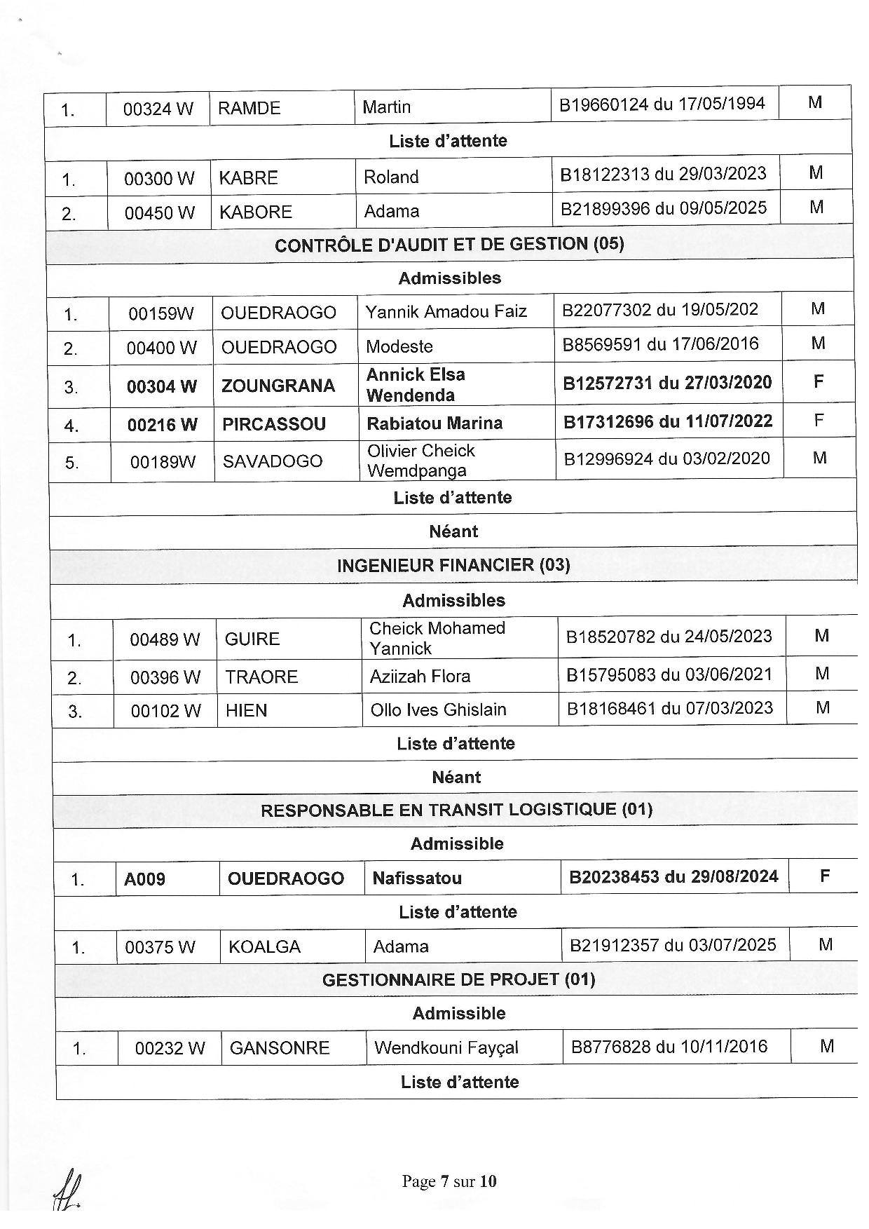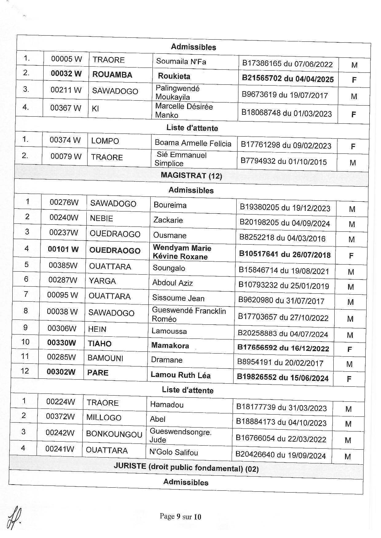 Les candidats ayant pris part à la phase d’entretien psychologique du concours direct de recrutement de la 16ème promotion des Elèves Officiers Spécialistes (EOS) du cycle 2025-2026 de l’Académie Militaire Georges NAMOANO, dont les noms suivent sont déclarés admissibles.