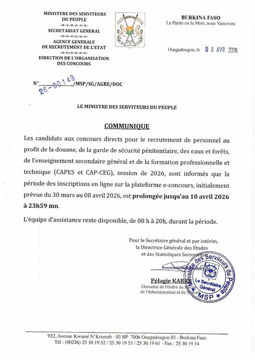 Les candidats aux concours directs pour le recrutement de personnel au profit de la douane, de la garde de sécurité pénitentiaire, des eaux et forêts, de l’enseignement secondaire général et de la formation professionnelle et technique (CAPES et CAP-CEG), session de 2026, sont informés que la période d’inscriptions en ligne sur la plateforme e-concours, initialement prévue du 30 mars au 08 avril 2026, est prolongée jusqu’au 10 avril 2026 à 23h59 mn.