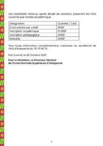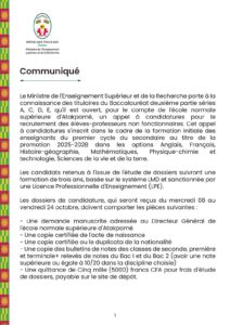 Le Ministre de l’Enseignement Supérieur et de la Recherche porte à la connaissance des titulaires du Baccalauréat deuxième partie séries A, C, D, E, qu’il est ouvert, pour le compte de l’école normale supérieure d’Atakpamé, un appel à candidatures pour le recrutement des élèves-professeurs non fonctionnaires.