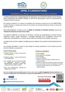 𝗟𝗮 𝗖𝗵𝗮𝗶𝗿𝗲 𝗔𝗰𝘁𝘂𝗮𝗿𝗶𝗮𝘁 𝗽𝗼𝘂𝗿 𝗹𝗲 𝗗𝗲́𝘃𝗲𝗹𝗼𝗽𝗽𝗲𝗺𝗲𝗻𝘁 𝗱𝗲 𝗹’𝗔𝘀𝘀𝘂𝗿𝗮𝗻𝗰𝗲, 𝗱𝗲 𝗹𝗮 𝗣𝗿𝗼𝘁𝗲𝗰𝘁𝗶𝗼𝗻 𝗦𝗼𝗰𝗶𝗮𝗹𝗲 𝗲𝘁 𝗱𝗲 𝗹𝗮 𝗙𝗶𝗻𝗮𝗻𝗰𝗲, initiative conjointe de l’Ecole Nationale Supérieure de Statistique et d’Economie Appliquée ENSEA et de l’Institut National Polytechnique Félix HOUPHOUËT-BOIGNY de Yamoussoukro (INP-HB), ouvre les candidatures pour le Master en Actuariat en Formation Continue, destiné exclusivement aux professionnels.