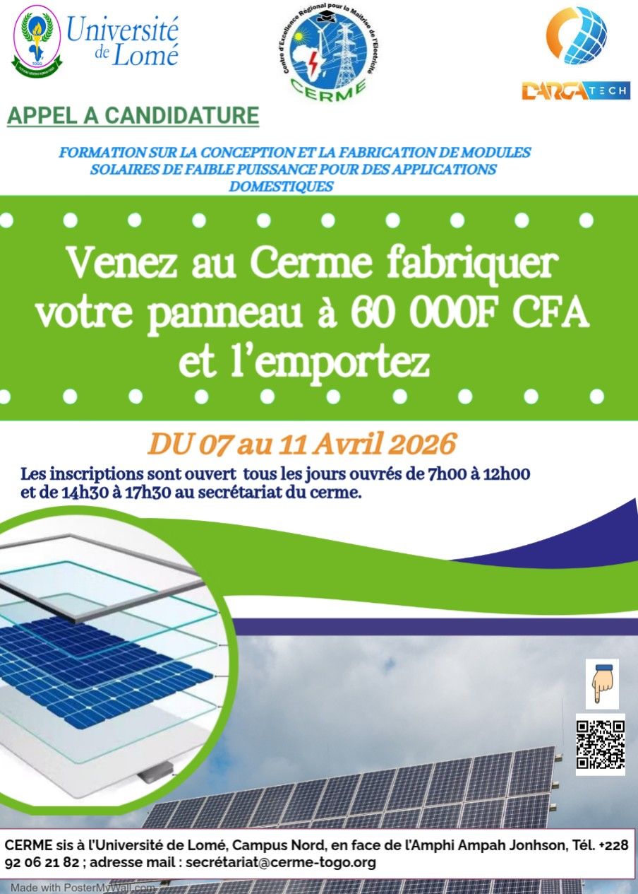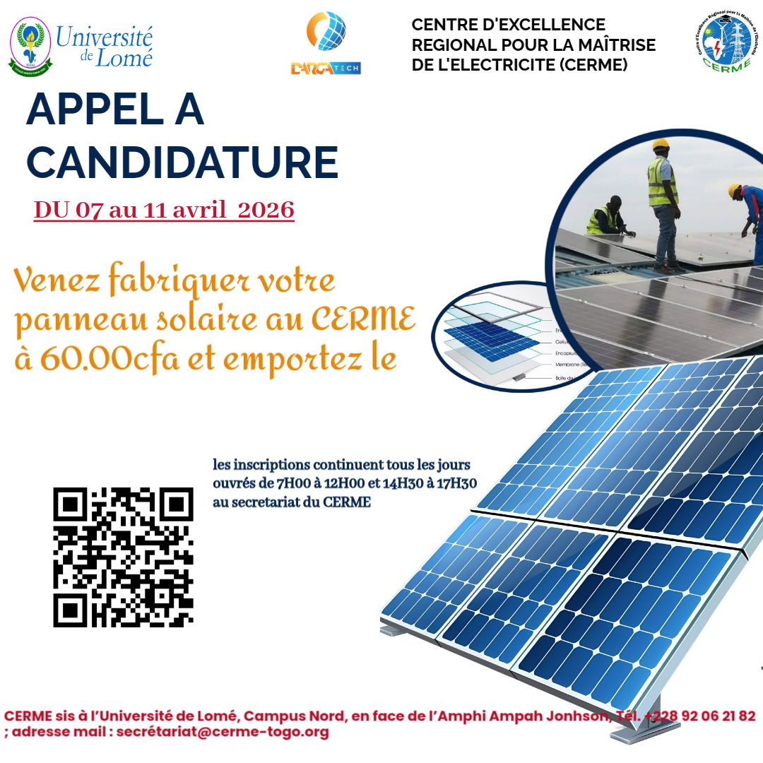 A l’Université de Lomé, le Centre d’Excellence Régional pour la Maîtrise de l’Electricité (CERME) lance un appel à candidature pour vous apprendre à assembler votre propre panneau solaire et de repartir avec votre création.