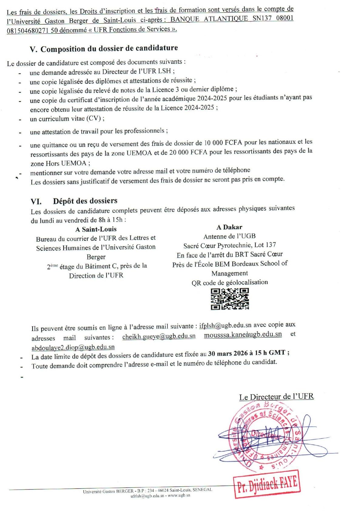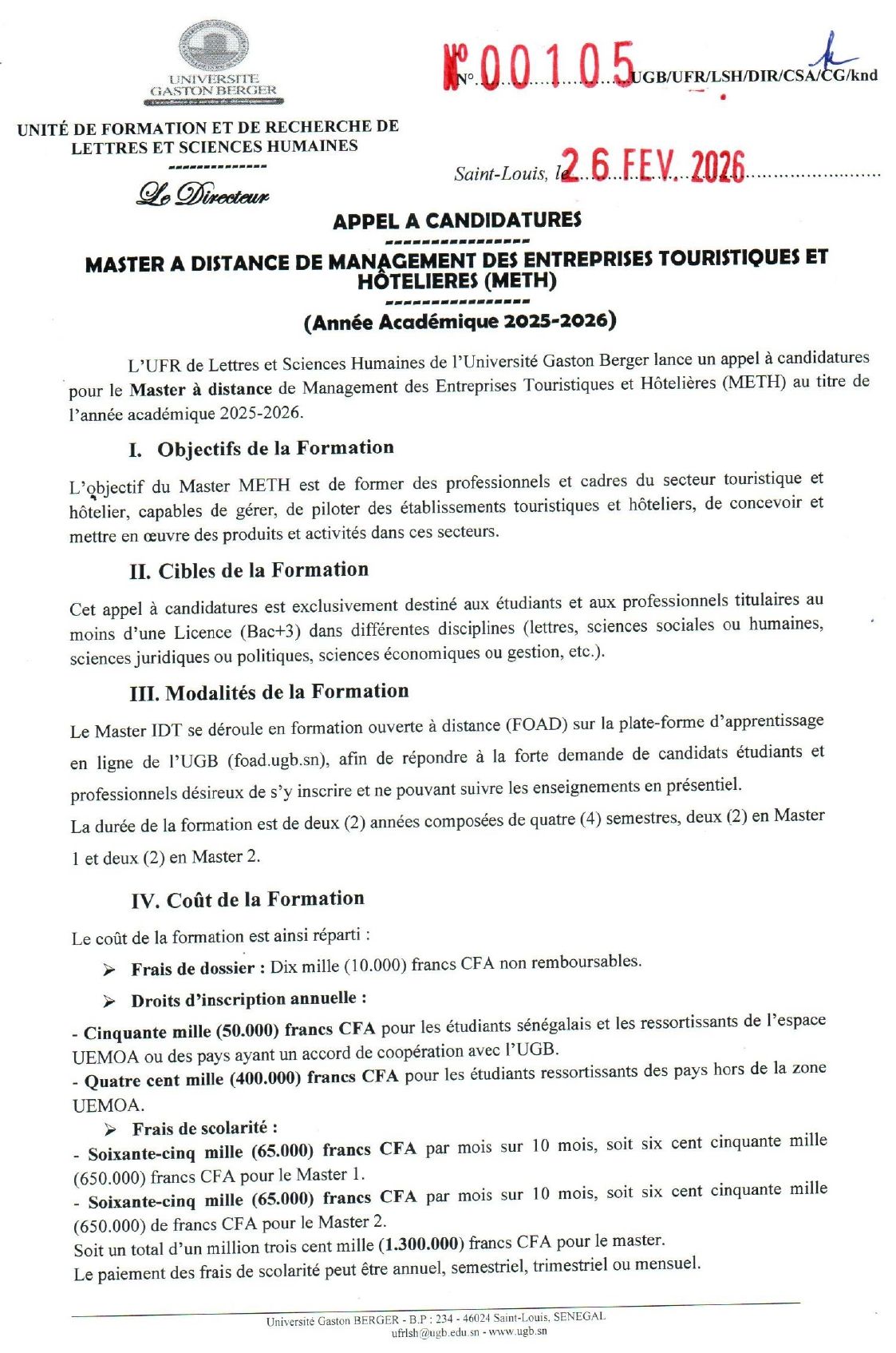 L’UFR Lettres et Sciences Humaines de l’UGB recrute pour la promotion 2025-2026 du Master METH, une formation 100% en ligne dédiée aux métiers du tourisme et de l’hôtellerie.