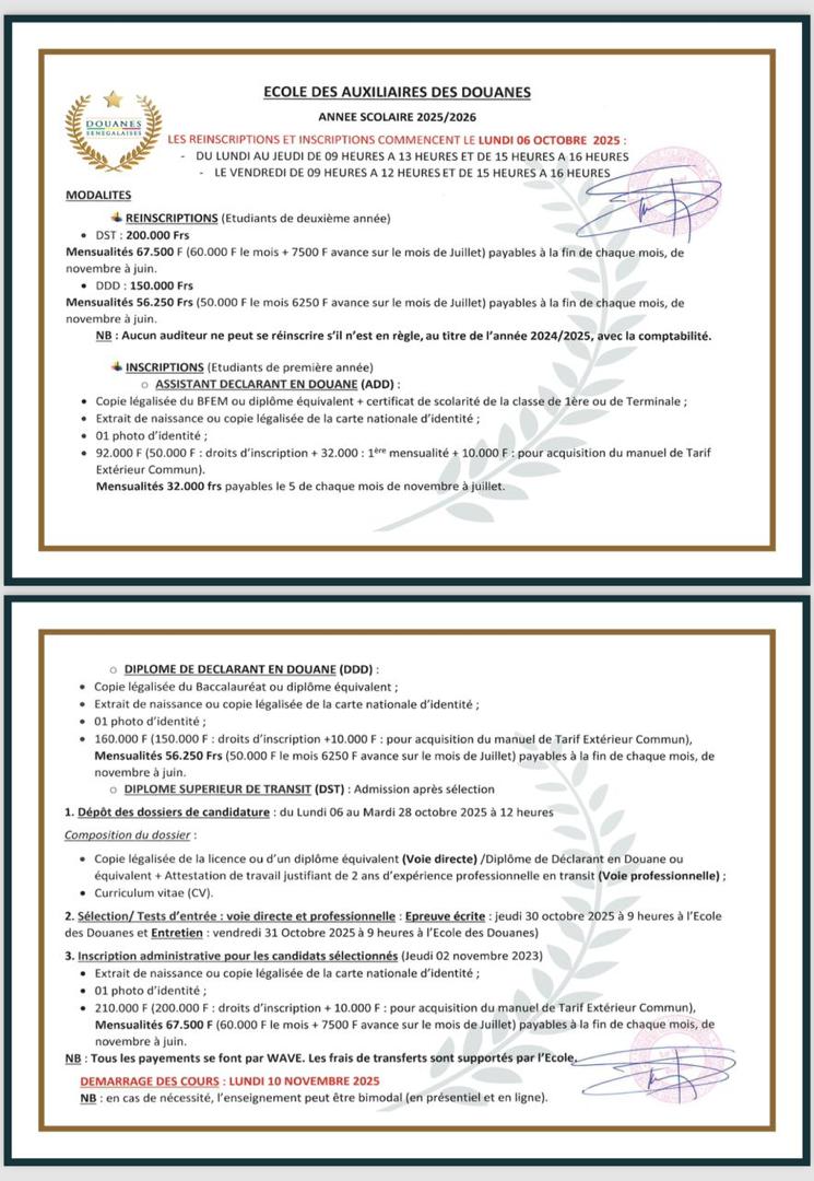 L’Ecole des Douanes est considérée comme la principale structure qui assure la formation des agents des Douanes. A ce titre, depuis 1970, elle a assuré la formation de tous les agents des Douanes des hiérarchies B2, B4 et C1 aux métiers des Douanes. Il s’agit des Contrôleurs (recrutés parmi les titulaires du baccalauréat ayant réussi au concours d’entrée et reçu deux années de formation), des Sous-officiers( recrutés parmi les titulaires du baccalauréat ayant servi sous les drapeaux , réussi au concours d’entrée et reçu deux années de formation), des Agents de Constatation (recrutés parmi les titulaires du brevet de fin d’études Moyennes ayant réussi au concours d’entrée et reçu une année de formation), des Agents Brevetés(recrutés parmi les titulaires du brevet de fin d’études Moyennes ayant servi sous les drapeaux , réussi au concours d’entrée et reçu une année de formation) et des Préposés des Douanes recrutés parmi les titulaires du certificat de fin d’études élémentaires ayant servi sous les drapeaux , réussi au concours d’entrée et reçu une année de formation …