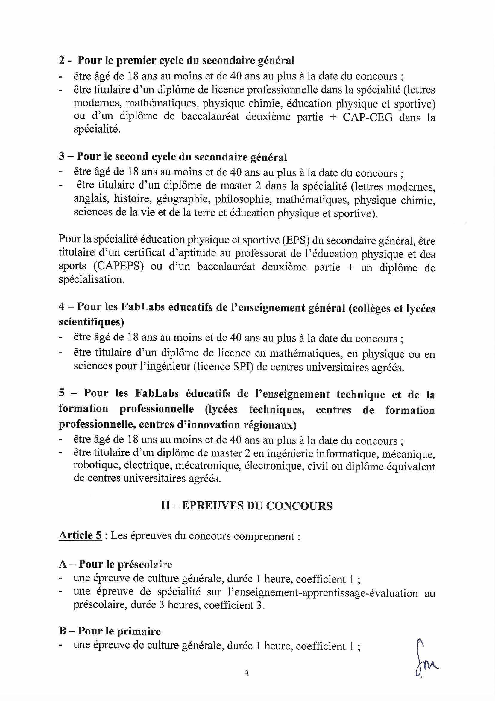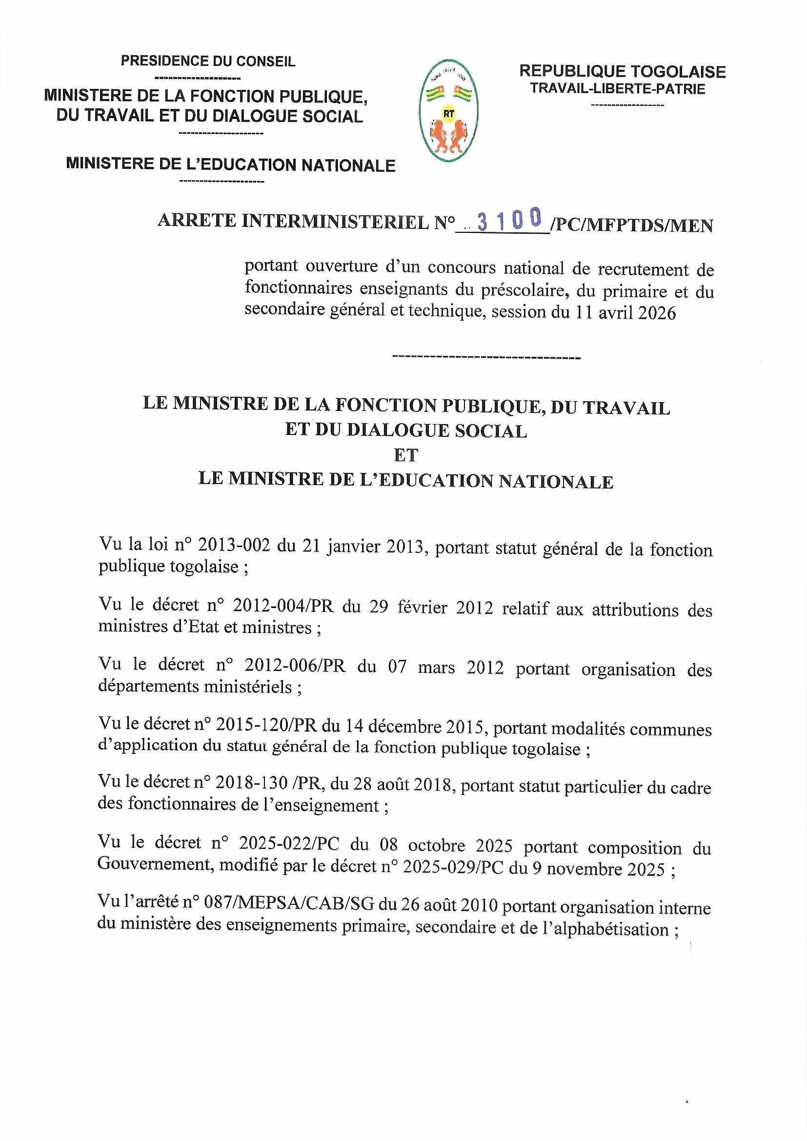 Article 1ᵉʳ : Un concours national de recrutement de fonctionnaires enseignants du préscolaire, du primaire et du secondaire général et technique est ouvert à l’intention des Togolais des deux sexes, pour le compte du ministère de l’éducation nationale, suivant les besoins spécifiques identifiés dans chaque région du pays.