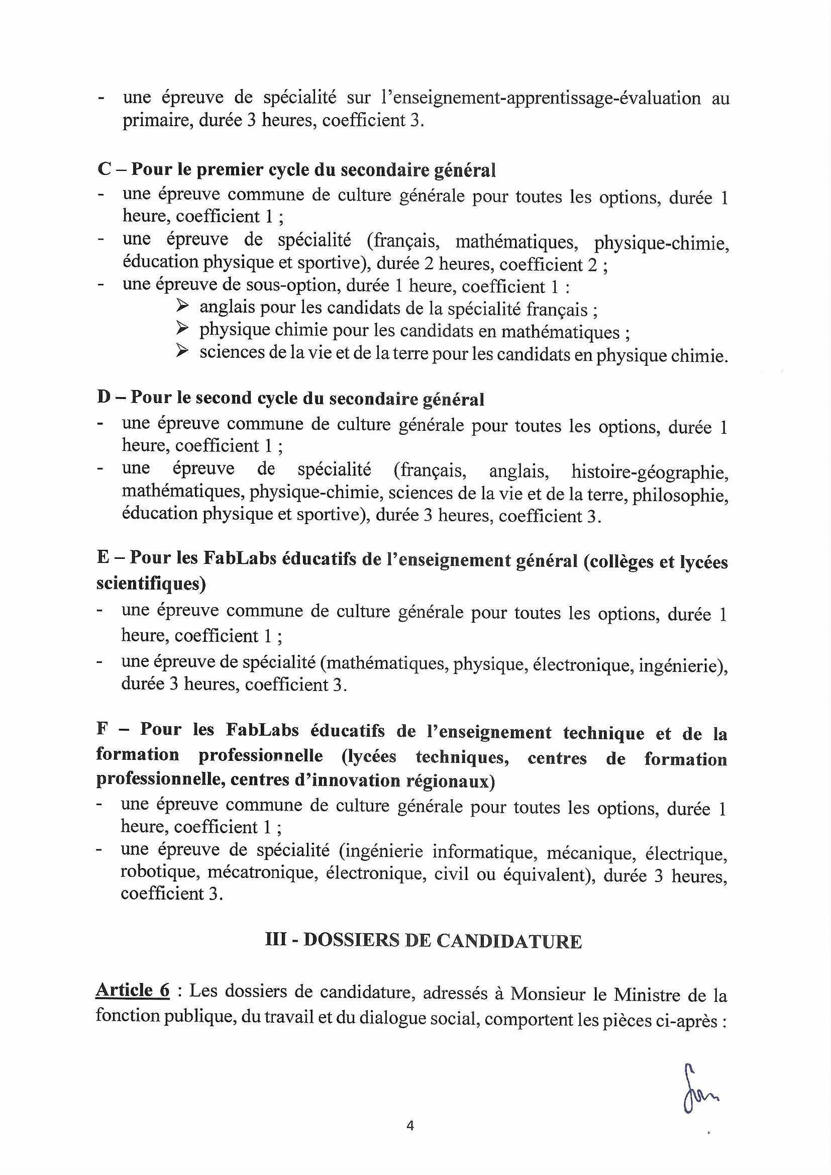 Article 6 : Les dossiers de candidature, adressés à Monsieur le Ministre de la fonction publique, du travail et du dialogue social, comportent les pièces ci-après :