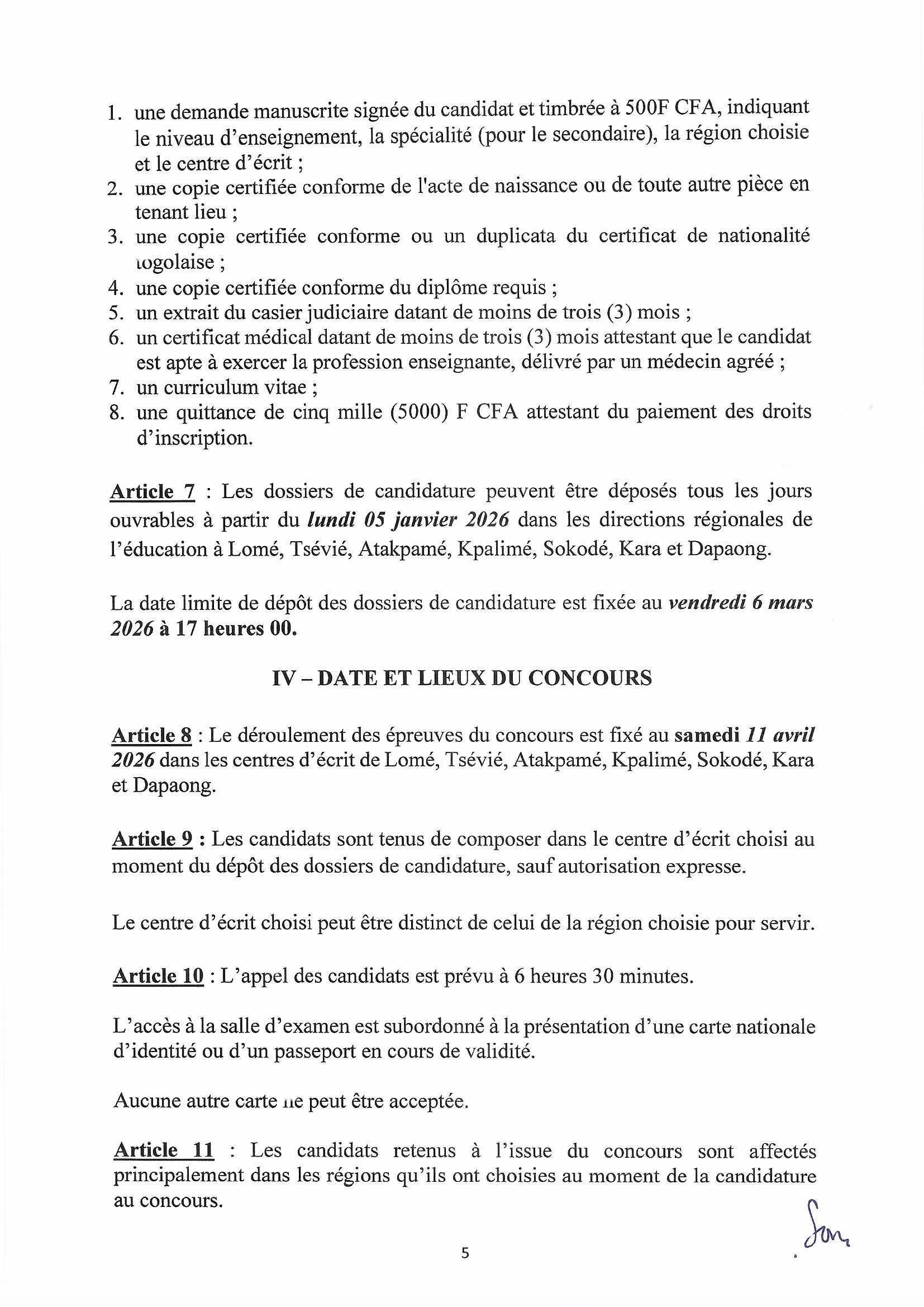 Article 8 : Le déroulement des épreuves du concours est fixé au samedi 11 avril 2026 dans les centres d’écrit de Lomé, Tsévié, Atakpamé, Kpalimé, Sokodé, Kara et Dapaong.