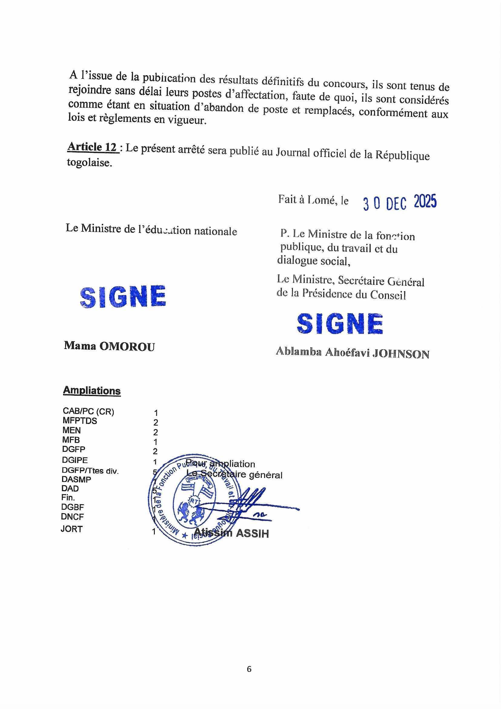 Article 12 : Le présent arrêté sera publié au Journal officiel de la République togolaise.