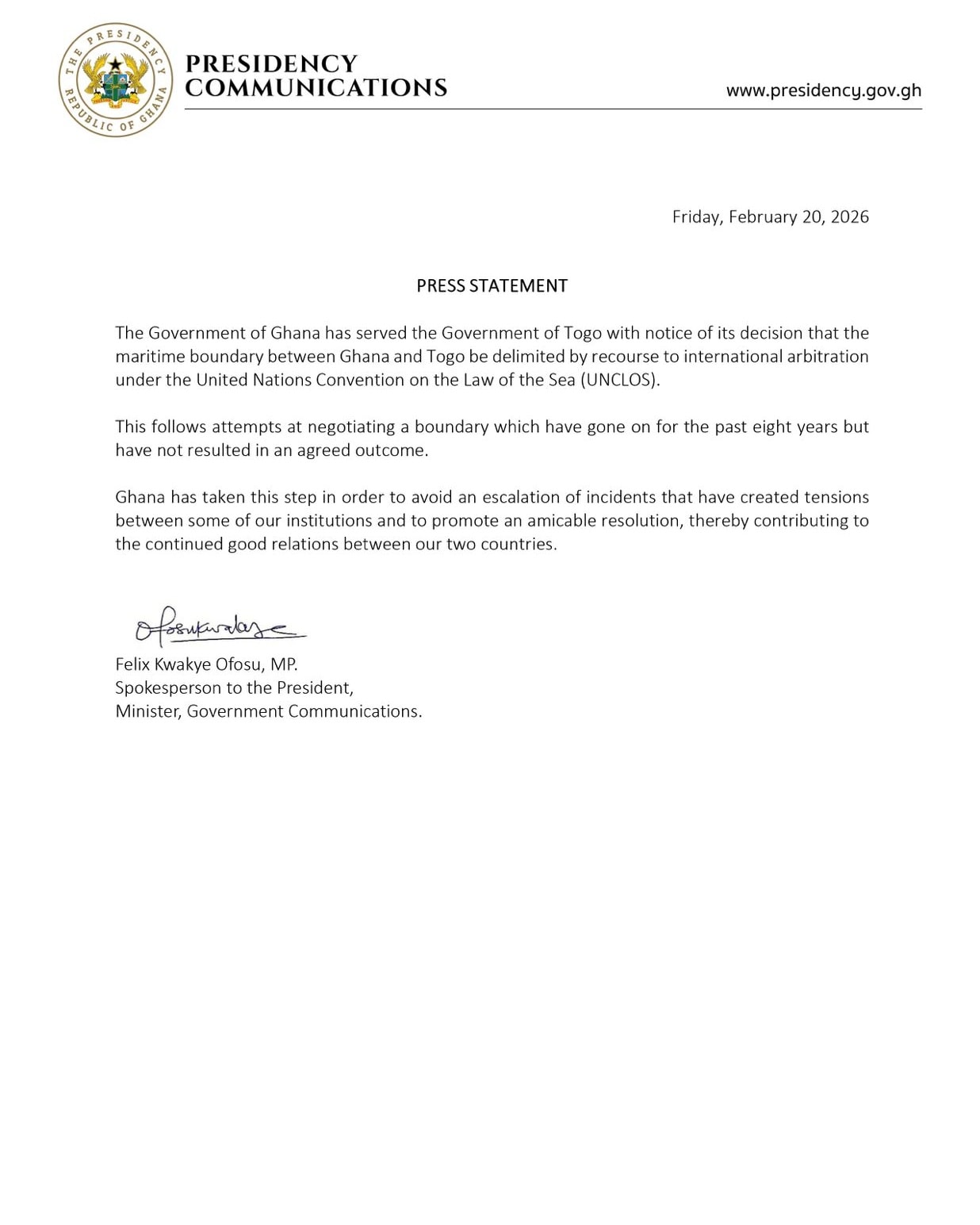 « Le gouvernement a officiellement notifié au gouvernement togolais sa décision de recourir à l’arbitrage international pour délimiter la frontière maritime entre les deux pays dans le cadre de la Convention des Nations Unies sur le droit de la mer (CNUDM) », indique la note.