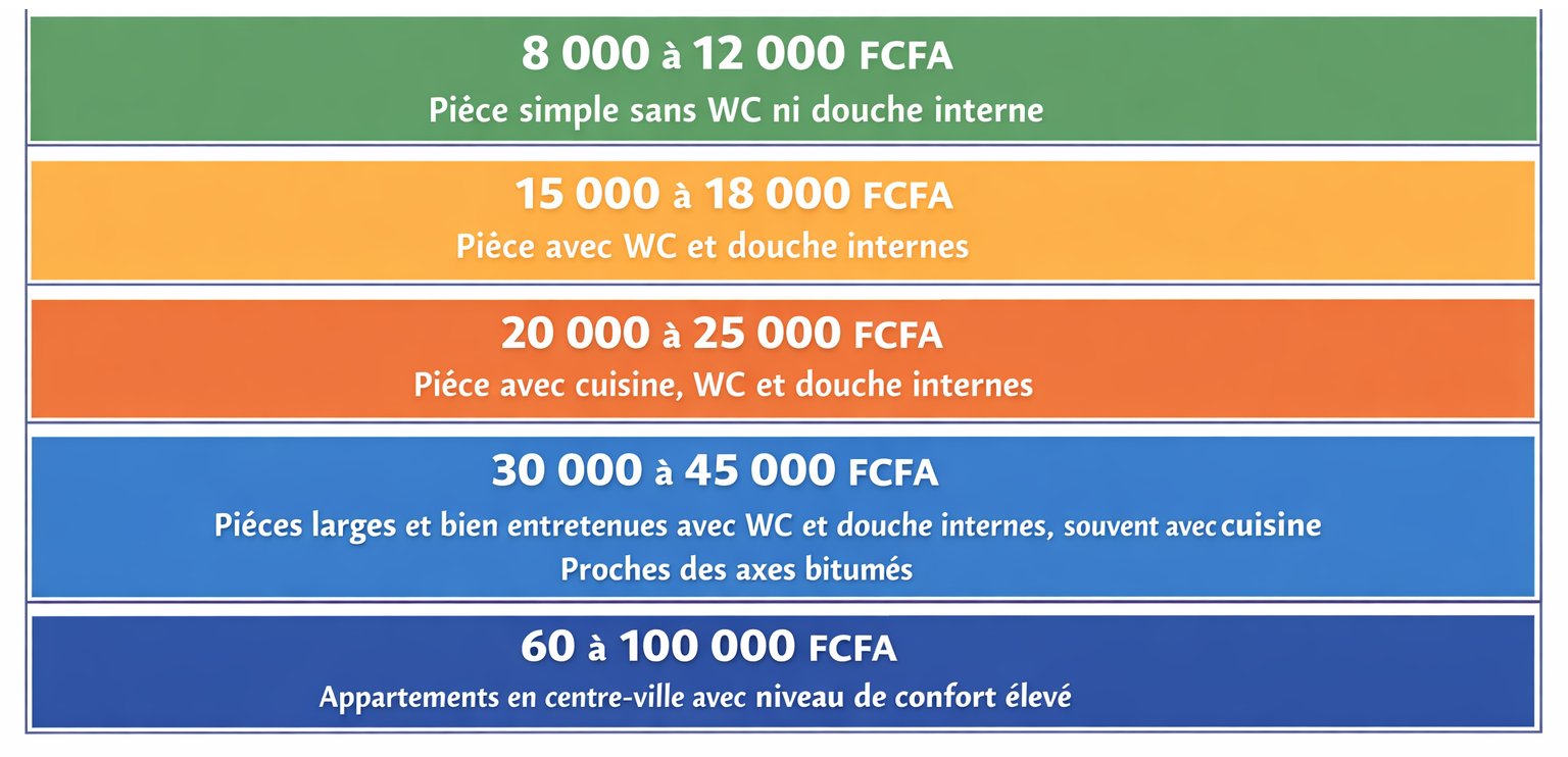 – 15 000 FCFA à 19 000 FCFA (pièce WC douche interne, avec cuisine et/ou terrasse)