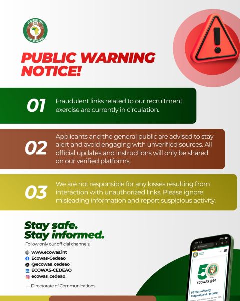 Ce vendredi 17 avril 2026, la Commission de la CEDEAO a alerté sur les liens frauduleux en rapport à son recrutement.