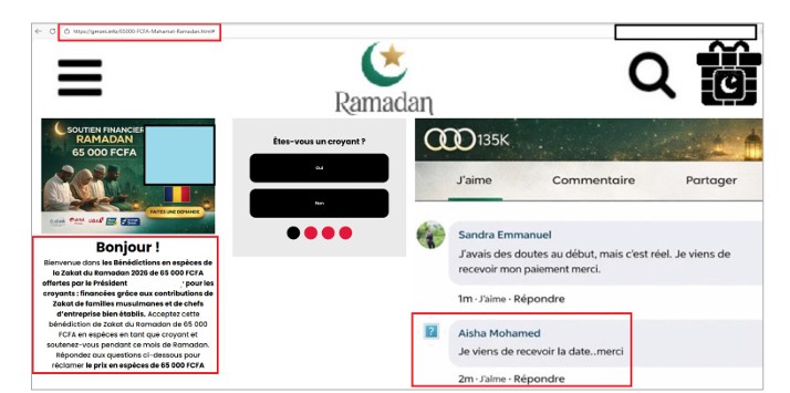En effet, le CERT.tg alerte sur le message circulant sur des plateformes de messagerie et réseaux sociaux proposant un soutien financier de 65 000 FCFA à l’occasion du Ramadan, prétendument offert par le Président d’un pays africain.