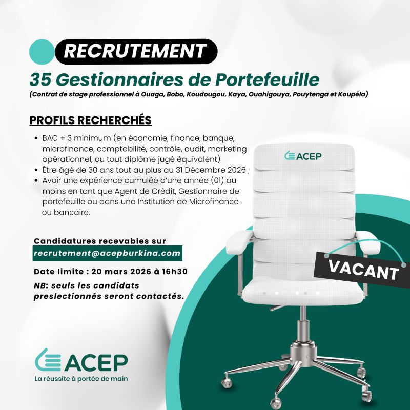 ACEP Burkina Faso recrute trente-cinq (35) Gestionnaires de Portefeuille Stagiaire (Homme ou Femme), en vue d’un stage professionnel sur l’ensemble de son réseau (Ouagadougou, Bobo, Koudougou, Kaya, Ouahigouya, Pouytenga, Koupela, Banfora)