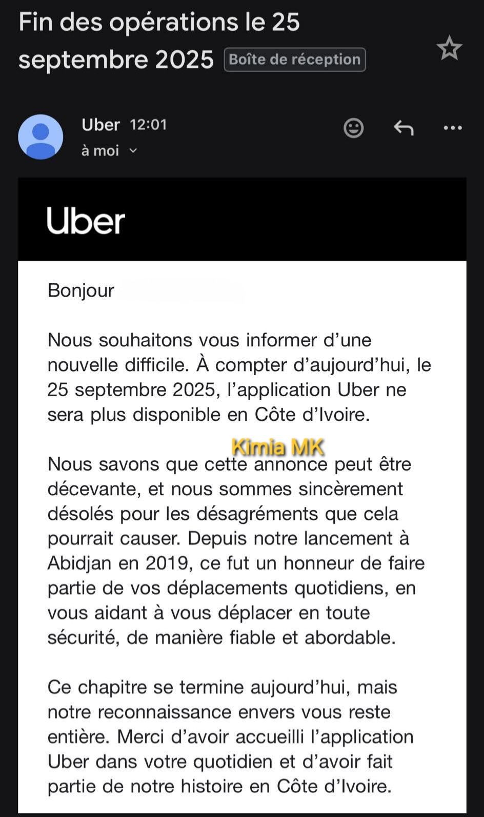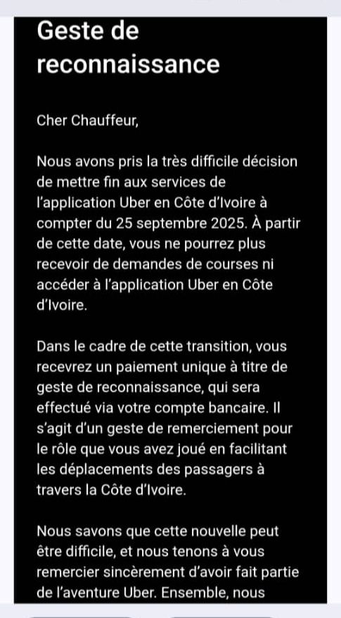 Nous avons pris la décision très difficile de mettre fin aux services de l’application Uber en Côte d’Ivoire à compter du 25 septembre 2025.